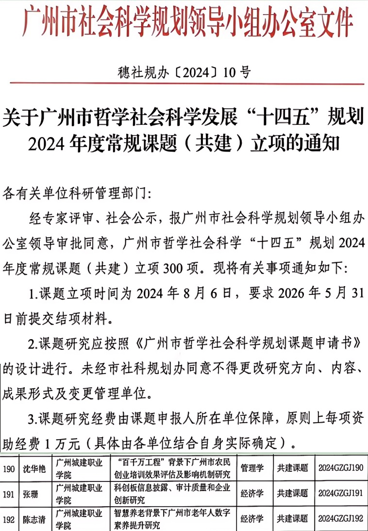近日,廣州市社會科學規(guī)劃領導小組辦公室發(fā)布了《關于廣州市哲學社會科學發(fā)展“十四五”規(guī)劃2024年度常規(guī)課題(共建課題)立項的通知》。我校經濟與管理學院沈華艷、張珊、陳志清主持的《“百千萬工程”背景下廣州市農民創(chuàng)業(yè)培訓效果評估及影響機制研究》《科創(chuàng)板信息披露、審計質量和企業(yè)創(chuàng)新研究》《智慧養(yǎng)老背景下廣州市老年人數(shù)字素養(yǎng)提升研究》課題成功立項。