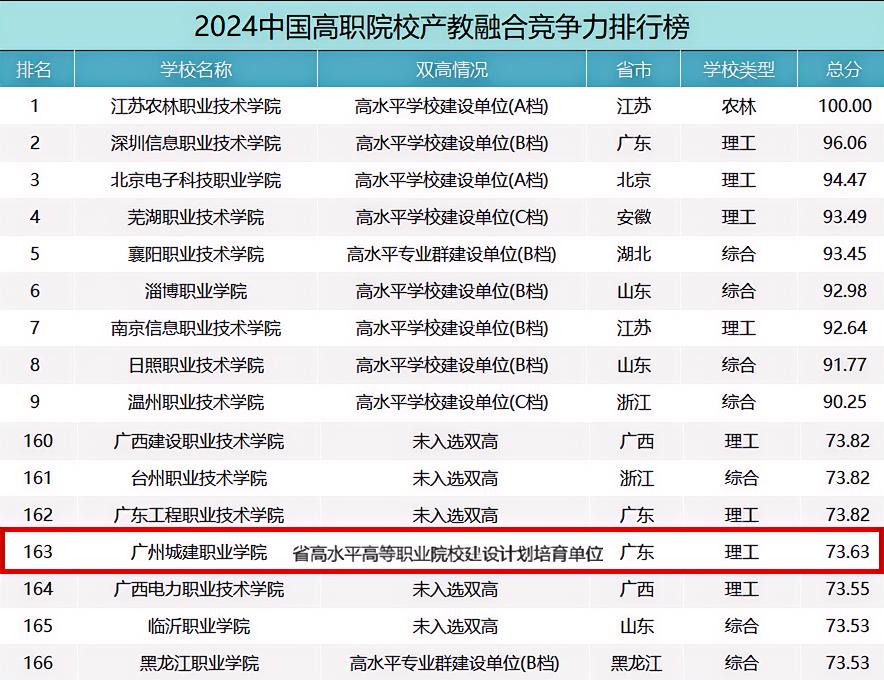 近日,全國第三方評價機構易睿評價發(fā)布2024中國高職院校產教融合競爭力院校名單,全國有1374所高職院校參與排名,我校位列全國第163位、全國民辦高職第1位、廣東省第18位。