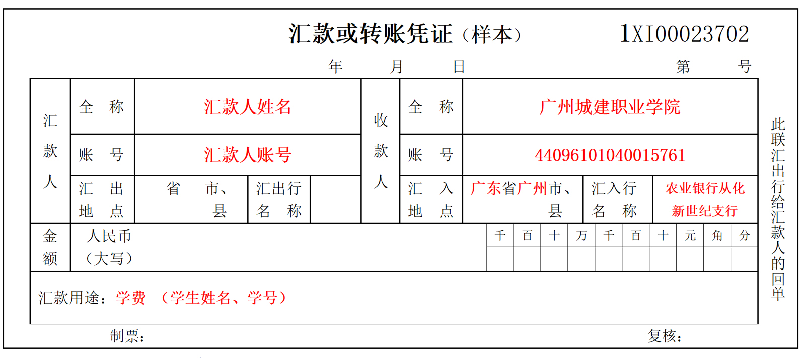 匯入行名稱: 中國(guó)農(nóng)業(yè)銀行廣州從化新世紀(jì)支行 ;金額欄填寫(xiě)繳費(fèi)金額和大寫(xiě)金額;