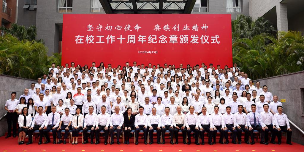 4月13日下午,學(xué)校舉辦方——廣州精通教育投資有限公司在圖書館前廣場,隆重舉行“堅守初心使命 賡續(xù)創(chuàng)業(yè)精神”在校工作十周年紀念章頒發(fā)儀式,廣州精通教育投資有限公司總經(jīng)理、學(xué)校董事會執(zhí)行董事張亞斌,校長蔣新華、黨委書記黃學(xué)茭等公司、學(xué)校領(lǐng)導(dǎo)出席活動,向新一批工作滿10年的教職員工頒發(fā)金質(zhì)紀念章并合影留念。學(xué)校全體管理干部、此次紀念章獲得者和新入職教師參加儀式。合影留念張亞斌在講話中對獲得紀念章的235 位...